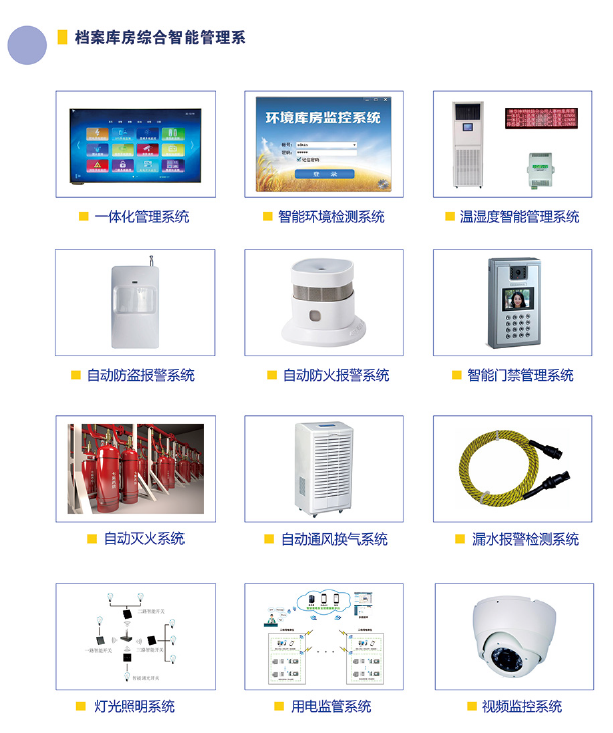 依据“十防”标准,虎恒智能确认了一套完善的档案库房监管控一体化解决方案。 系统构成有: