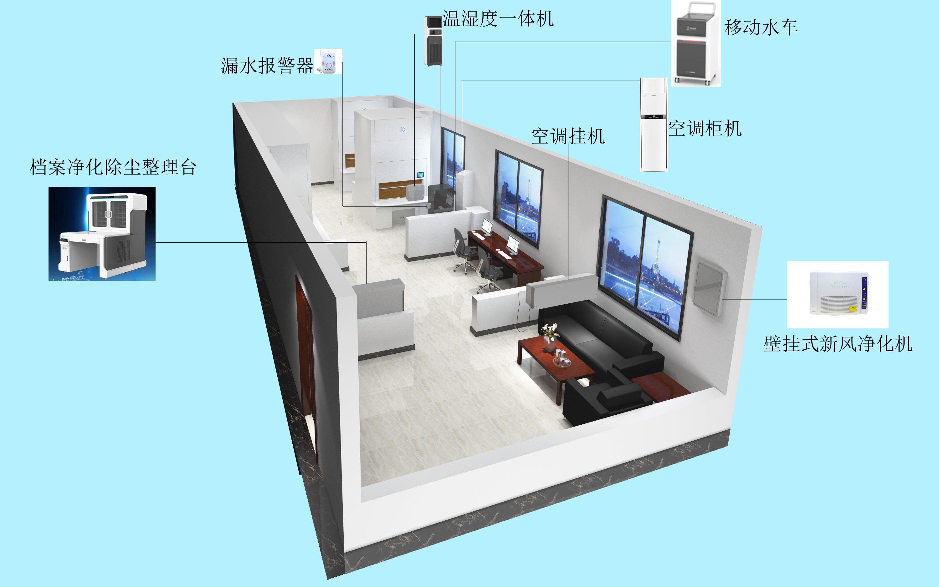 智慧档案库房是一个很大的系统,也叫中央控制系统,概念比较大,包含了很多的子系统:档案数字化系统、智能库房环境控制管理系统、智能档案柜控制系统。其中智能库房环境管理系统又包含了很多子系统:1、温湿度消毒净化一体控制系统2、红外防盗报警系统3、视频监控系统4、门禁系统5、漏水报警系统6、智能防火报警、灭火系统7、综合布线等组成。智能档案柜控制系统主要以(智能档案回转柜系统和智能密集架系统)为主。