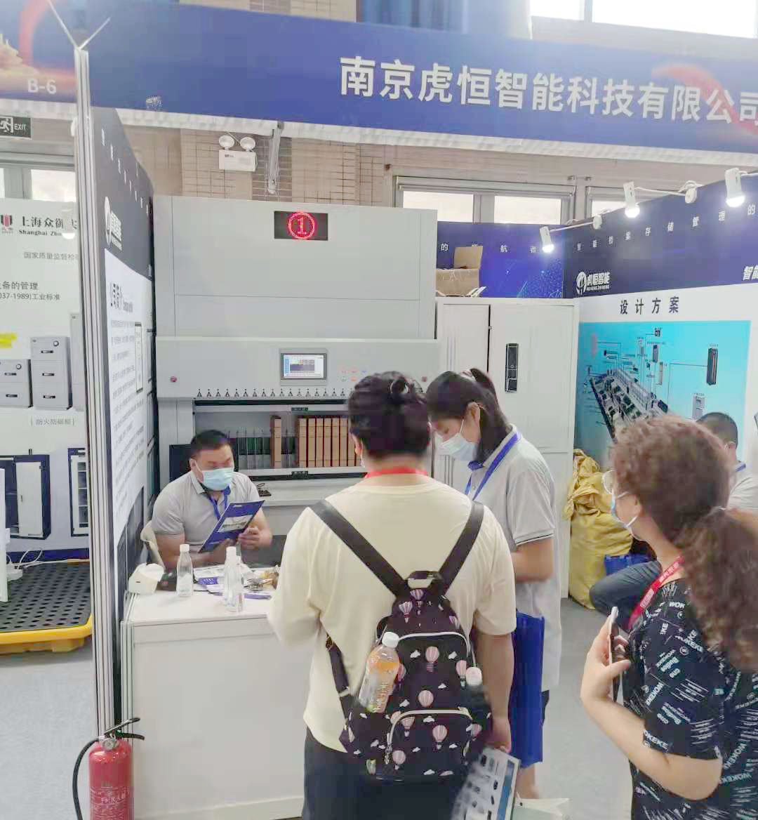 我们这次展示的是我们的RFID射频实时盘库档案柜,可以精准定位到盒,并且实现档案的无序摆放有序管理。展会现场前来咨询了解我们智能回转柜的嘉宾是络绎不绝,身为虎恒人,我们很是开心与骄傲,因为这意味着我们的产品得到了市场的肯定与认可,也说明我们的这一产品正是大家需要并且一直在寻找的产品。